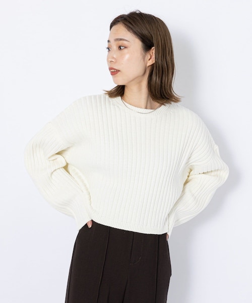 定番アイテムこそまわりと差をつける。シルエットの遊びが魅力の1着。・トレンドのショート丈・女性らしいロングスリーブ・すっきりとした首元【生地・デザイン】ショート丈とロングスリーブのバランスが可愛いニットが入荷。全体的にゆるっとしたシルエットで女性らしさたっぷりのデザイン。ゆとりはありながらも今季トレンドのショート丈で、オシャレ度もアップ。首元はすっきりめなので、ニットでも重たい印象にならずに着ていただけます。秋冬定番アイテムだからこそ、周りと差を付けたい方におすすめの1着。モードにも着られるホワイト・ブラック、カジュアルにぴったりのブラウン、存在感抜群のピンクとの4色展開です。【コーディネート】ショート丈を活かして、ハイウエストボトムでスタイルアップコーデに。身長問わず楽しんで頂けるバランスなのでおすすめです。ベーシックカラーの3色はカラーパンツに合わせてオトナカジュアルに。ベーシックをおしゃれに着たい方必見です。