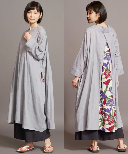 着物の隠れたお洒落『八掛(はっかけ)』と袴(はかま)をイメージしたデザイン。 正面から見るとシンプルな印象の無地ですが、後ろ姿は切り替えし部分に日本の千代紙の模様・菖蒲の花柄を忍ばせています。 歩くたびに見え隠れする花柄が粋でお洒落。 着物の重ねのような衿元は、着るだけで大人な和の装いに。 ゆったりとしたオーバーサイズと、軽やかな綿素材でリラックス感のある着心地です。 菖蒲の花言葉は「よい便り」 「嬉しい知らせ」。 ◆カヤ◆ 古くから伝わる日本の伝統と新しい文化の融合。 「新しいカタチの日本」に出会える倭物ブランド【カヤ】 「文明開化」をテーマに、倭モダンで色彩あふれる刺激的な和雑貨を提案していきます。 ※こちらの商品は1点1点職人による手作りとなります。その為、生地の取り方により柄の配置や形・色合いなど若干異なる場合がございます。(画像は一例です。)あらかじめご了承ください。※屋外での撮影画像は、光の当たり具合で色味・カラーが違って見える場合がございます。商品のカラーは、スタジオ撮影の画像をご参照ください。 Amina Collection Co.,LTD.