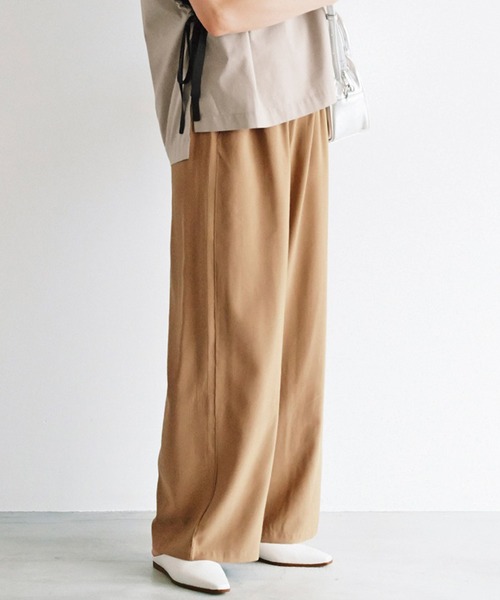 雑誌、広告、カタログなどで活躍中の 人気スタイリスト佐藤かなさんプロデュース avecmoi[アヴェクモワ] 夏のおしゃれもこれで安心 シンプルなTシャツも、デザインのきいたトップスも受け止めてくれる包容力と、暑い季節にうれしいリラックス感のどちらも両立できるように、レーヨン混の素材でドレープが美しいワイドパンツを作りました。 ウエスト上部のミニフリルは、トップスをウエストインしても家着感が出ないようにしたこだわりのディテール。 共生地を挟み込んで前身ごろにふることで生まれたサイドのラインも、洗練度を高めてくれるアクセントになっています。