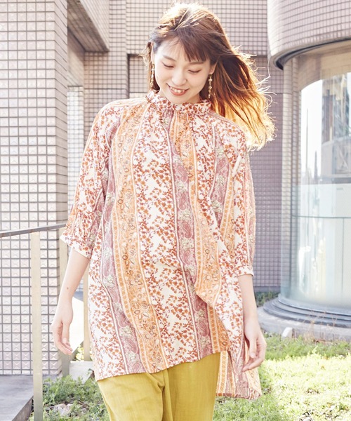 ◆◇ Block Print Tops ◇◆ 心奪われるヴィンテージワーク。 小花柄が入ったコットンドビー織りに、インドの伝統技法『ブロックプリント』を全面にほどこしたこだわりのトップス。 どこかレトロな雰囲気を感じさせるカラーリングで、大人なフォークロアスタイルに◇◆ 襟元のバンドカラーとバックボタンも大人っぽく上品な印象にしてくれます。 --- ブロックプリント --- 手彫りで精巧な木版を作り、その木版に染料を付け、熟練した職人さんがひとつひとつ手で押して布に模様を染め付ける、とても手の込んだ伝統技法。色毎に版が異なりますので、色が多ければ多いほど作業工程も多くなります。全てハンドメイドの為、多少の版のズレも手作りならではの温かみ。味のある風合いを感じられる、そんなひと品です。 ※こちらの商品は1点1点職人による手作りとなります。その為、生地の取り方により柄の配置や形・色合いなど若干異なる場合がございます。あらかじめご了承ください。※屋外での撮影画像は、光の当たり具合で色味・カラーが違って見える場合がございます。商品のカラーは、スタジオ撮影の画像をご参照ください。 Amina Collection Co.,LTD.