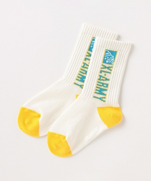 メリハリのある配色デザインが元気を与えてくれるクルーソックスです。サイドにはXL-ARMYロゴを大きくあしらい、さらに個性をアピール! リブ地で切り替えたフィット感のある足首部分は、スポーティームードをただよわせます。足裏にはすべり止めプリントつきです。