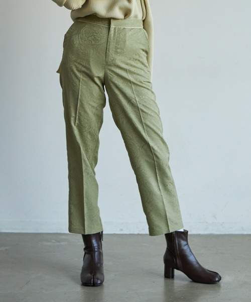 - 2021 VACANCY PRE FALL COLLECTION - ◆ジャガードのペイズリー柄が秋冬らしい、こだわりのテーパードパンツ 【特徴】 さりげないペイズリー柄は ジャガード生地で立体的に仕上げており 高級感のあるテーパードパンツ。 センタープレスの加工もあり シルエットがきれいに見えるデザイン。 ウエストとバックポケット部分には パイピングの加工があり、 タックインのスタイルで さりげなく見えるのもこだわりです。 【スタイリングポイント】 同素材のワンピース(ブランド品番:VCFLE0521001)とset upで こなれ感のある着こなしもおすすめです♩ 存在感のあるアイテムなので トップスには無地のアイテムを合わせて バランスよく着こなすのが◎ シンプルなワンピースにプラスして、 足元から少し覗かせることで トレンドのレイヤードスタイルもかなえてくれるアイテムです。 ・・・・・・・・・・・・・・・・・・・・ 透け感:なし 裏地:ナチュラルのみあり 伸縮性:なし 光沢感:あり 生地の厚さ:普通 ・・・・・・・・・・・・・・・・・・・・ 【お買い物をお楽しみいただく為に】 ▼お気に入り登録をオススメ致します▼ ♡をクリックして下さい。 ・《商品のお気に入り登録》で再入荷通知や、ラスト1点の通知、セールの際の通知も受け取ることができます。 ・《ブランドのお気に入り登録》で新作商品や再入荷など、お得な情報を受け取ることができます! 【ATTENTION】 ※画像の商品はサンプルです。 実際の商品と色味、仕様、加工、サイズ、素材等が若干異なる場合がございます。 ※撮影場所やお使いのモニター環境により若干お色味が異なる場合がございます。 ※製品によっては染料の特性上、湿った状態や汗をかいた状態での長時間の放置、または摩擦により、他のものへ色移りする恐れがありますので、着用時にはご注意下さい。 ※お洗濯は洗濯ネットを使用し、他のものとの混合洗いはお避け下さい。色落ちや色移りの原因となります。 タンブラー乾燥はお避け下さい。 ※風通しがよく、湿気の少ない日の当たらない場所で保管して下さい。 ※また製品加工上、お手元に届く際に匂いが生じる場合がありますが、 ご使用を続けていく事により匂いは軽減されます。