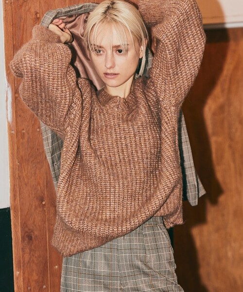 ふっくらとしたボリューム感が可愛いローゲージニット。 リラックスしたサイズ感が秋冬ムードたっぷり。 フロントはゆるめのクルー、バックはVにすることで360度抜け感のある印象に仕上がりました。 手にかかる長めの袖丈も可愛さポイント! ボトムにはタイトスカートや、細みのパンツがすっきりとまとまるベストバランス。 【素材】 3ゲージ片畔 膨らみがあり、柔らかな風合いが特徴 ストレッチあり 透け感なし