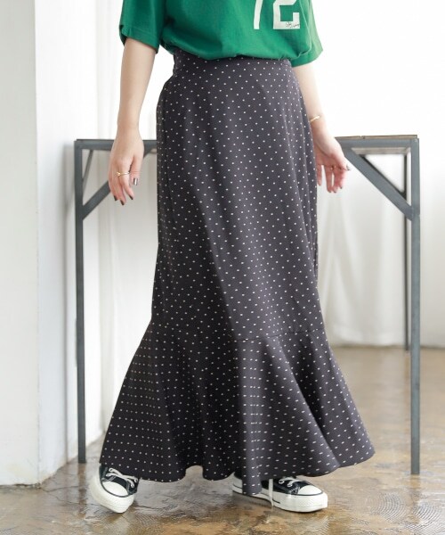 ーーー低身長さんにおすすめのドット柄マーメイドスカート。下の位置で切り替えているので全体はすっきりで女性らしいシルエットに。ウエストはファスナーとホックでウエスト回りも綺麗に見せてくれます。後ろがゴムなのも嬉しいポイント。ーーートップスをインする着方や、チュニック丈のトップスとのゆったり合わせなど、いろいろなコーディネートが楽しめます。