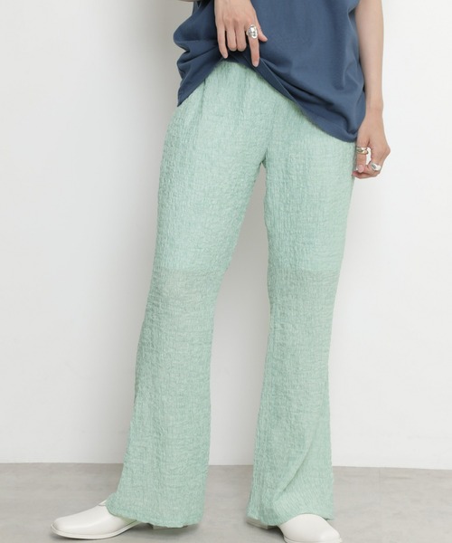透け感のある素材でさわやかなイメージのシャーリングパンツ ・レイヤードしやすいシルエット ・膝より下部分は透け感のあるデザイン ・清涼感のある薄手の生地 【スタッフレビュー】 薄手で清涼感のあるシャーリングパンツ。ワンピースやチュニックに重ねて使いやすいデザインです。ひざ下からの透け感が涼し気な印象をプラス。梅雨のシーンから夏にかけて活躍するアイテムです。