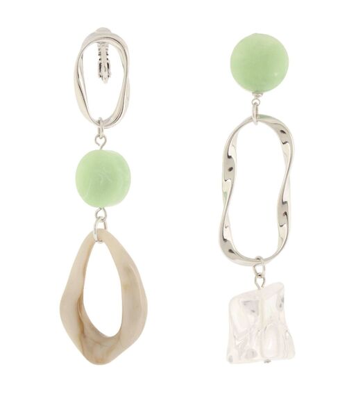 マーブル調のアクリルとメタル、クリアで石のような変形パーツを組み合わせたイヤリング。アシンメトリーでキャッチーなデザインです。少し大きめなパーツがカジュアルなコーディネートにぴったり◎
