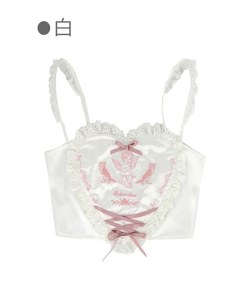 ほんのり甘さの中に色っぽさを感じる Bobon21夏限定コケティッシュな魅力を放つ新作 クラシカルかつ繊細なエンジェル刺しゅう BIG HEARTの周りにはヴィンテージレースで囲い さらにレースアップ投入で絶妙な立体感を表す 生地のツヤ感からフィットしたシルエット ドキッと感を加速させる魅惑キャミソール 「白」と「ピンク」の2色展開