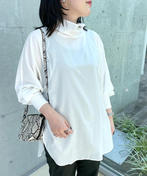 抜け感のある程よい高さのハイネックが小顔効果に ●デザイン トレンドのハイネックシャツ。 タンブラー加工を施したナチュラルな表情のタンブラー生地でお作りしています。 長めの丈感でラウンドヘムデザインなので、レイヤードスタイルも決まります。 袖口は同色のテレコ使いでイージーに着用しやすくなっています。 ●おすすめコーディネート デニムやニットパンツと合わせたカジュアルなコーディネートから、タイトスカートやスラックスと合わせたきれいめなスタイリングとも相性の良い、着回し力抜群のシャツです。 今季はサロペットとの合わせがおススメ◎ ●素材 本体:ポリエステル78% 綿22% 袖口部分:綿100% ・さらっとした肌触り ・イージーケアも嬉しいポイント 洗濯方法:洗える 透け感:オフホワイトのみややあり 裏地:なし 伸縮性:なし 生地の厚さ:普通 光沢:なし ============================== 【注意点】 ※画像の商品は光の照射や角度、お使いのモニター環境により、 実物と色味が異なる場合がございます。 あらかじめご了承下さいませ。 ============================== 【お買い物をもっと便利に楽しく♪】 『♡』をクリックでお気に入り登録 ・「商品のお気に入り登録」で・・・ ラスト1点や再入荷の通知が届きます。 登録して頂いた商品だけが対象となる、あなただけのタイムセールが開催されることも! ・「ブランドのお気に入り登録」で・・・ 新商品や再入荷など、いち早くブランドのお得な情報を受け取ることができますので、ご登録をおすすめします! ==============================