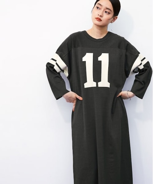 ◆2021-22秋冬◆ADAM ET ROPE' FEMME【Material】表面は、レーヨンで艶やかな光沢のある素材、裏面は、肌触りの良いコットンで、程よく厚みのある透けにくいプレーティング天竺素材を使用。製品洗いをかけることで裏面のコットンが表に吹き出し、着込んだかのような、こなれたヴィンテージライクな雰囲気に仕上がっているのが特徴。【Design】ナンバリングプリントを施した、前後で着用可能な2WAYロングワンピース。光沢感のあるジャージー素材にラバープリントすることで