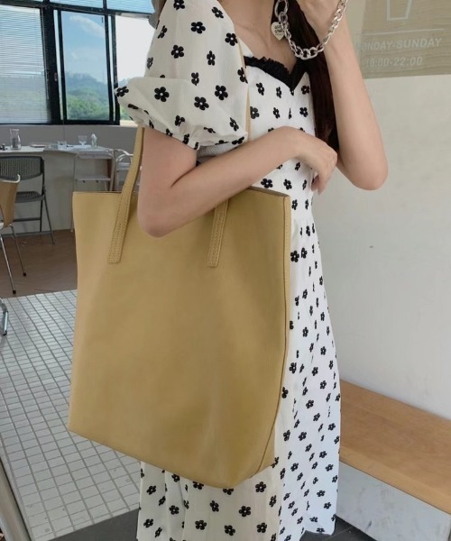 【1枚仕立ての柔らかいレザー調の上品トートバッグ】 高級感のあるレザー調の素材感が大人な印象。 シンプルなデザインなので、デイリーにも通勤用としても活躍するアイテムです。 ■素材 合成皮革を使用しております。 ・軽くて持ちやすい ・汚れもサッと拭き取ることができるので、お手入れしやすい ■デザインポイント/素材 A4サイズが入る大きさ、更に1枚仕立てで軽量なので使い勝手◎ マグネット開閉なので口を大きく開けられて荷物の出し入れもしやすく、同素材のインナーポーチ付きなのでバッグインバッグとしても使えるおしゃれなのにデイリー使いしやすいアイテムです。 柔らかめのレザー調素材なので女性らしい印象の大人っぽいコーデに合わせやすいです。 シンプルなデザインなのでデイリーにも通勤用にも使えるハンドバッグです。 ............................... 開閉・・・マグネット仕様 内側仕様・・・無し 付属品・・・インナーポーチ ................................ ■カラー&オススメコーデアイテム ブラック/マスタード/グリーン マキシワンピやカラーワイドパンツに合わせてストリート系のカジュアルスタイルに! 花柄ワンピースや、透け感のあるシアーシャツに合わせてフェミニンコーデに! シンプルにTシャツ×ジーンズに合わせても大人カジュアルに決まり可愛いです。 ◆ブランド品番:LC45119970◆ ◆ 商品お気に入り登録 ◆ 右のハートをクリックすると、お気に入り登録アイテムの再入荷・在庫ラスト1点等の通知を受け取れます。 ◆ブランドお気に入り登録 新商品や再入荷など、いち早くブランドのお得な情報を受け取ることができます! ※撮影環境やご利用の画面により見え方やカラーに差が出る場合がございます。