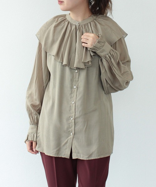 ■ボリュームギャザーブラウス×フリルカラー【デザイン】たっぷりギャザーの入りボリューム感がありながらも程よい透け感で初秋にっぴたりのアイテム。ブラウスは前後2wayで着用可能。ボタンを前にして羽織としても◎今季トレンドのフリルカラーもセットになっていて取り外しが可能なのでフリルブラウスとしても楽しめます。【素材】透け感 :あり裏地 :なし伸縮性 :なし光沢感 :なし洗濯 :手洗い可【スタイリング】着丈が少し長めなのでデニムと合わせてカジュアルダウンもおすすめ。軽い素材感なのでインスタイルも◎様々なコーデを楽しんでいただけます。