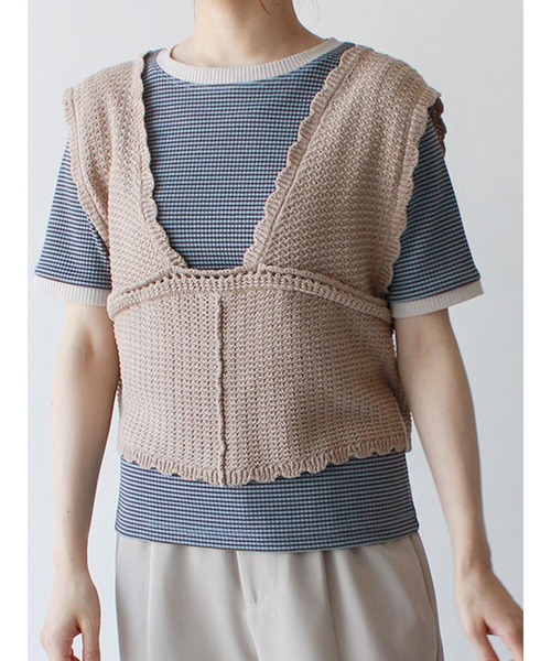 優しげな表情を添えるスカラップレースがアクセントのニットビスチェ。 シャープなVネックが顔周りをすっきりとした印象に見せてくれます。 コーディネートにプラスワンするだけでも、こなれ感のあるスタイリングが楽しめるアイテム。