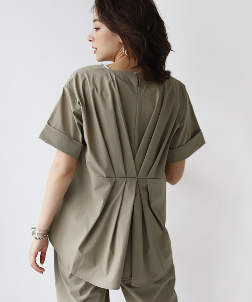 UVカット・接触冷感・撥水加工など快適に過ごすための機能が備わったブラウス。 機能性だけでなく、オシャレを楽しめる優秀アイテム。 Point1:後ろにギャザーデザインでウエスト回りをスッキリ見せ。くびれが作れる美シルエット。 後ろでつまんだようなギャザーデザインでこなれ感とウエスト回りをスッキリ見せで 美シルエットをキープできるブラウス。 また同じ素材のテーパードパンツ・ワイドパンツとセットアップとしても着こなすことができ、 大人上品に決まるスタイリングを作ることもできます。 Point2:UVカット・接触冷感・撥水加工の優秀な機能性 暑い夏の時期、梅雨の時期には嬉しい機能性が詰まった素材を使用。 撥水性のある生地なので、雨の日など水をはじき、濡れる心配はほとんどありません。 強い日差しから守り、ひんやりする冷感機能もあるので夏には快適に過ごせるアイテムです。 Point3:ストレッチ素材で伸びて着やすさ抜群!イージーケア素材でお手入れ簡単 伸びるストレッチ性ある素材でストレスフリーで着ていただけます。 またシワになりにくい加工でアイロンの手間いらずでお手入れ簡単なイージーケア商品です。 お手入れ:手洗い・ドライクリーニングにてお手入れして下さい。