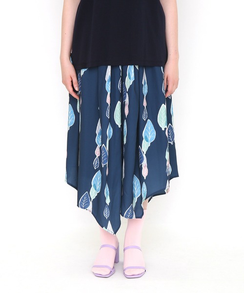 はらはらと落ちる木の葉をモチーフにしたパターンデザイン。素朴なモチーフを透明感のある色彩で表現した、かわいらしいデザインです。ふわっとした動きの出るヘムラインのAラインスカート。着回ししやすく色々なシーンで活用できます。後ろウエストはゴム仕様。サイドシームポケット付き。[ご使用に関する注意] ●この商品は染料の特性上、雨や汗などによる水濡れ、摩擦が加わる状況での使用により、色落ちや色移りする可能性がございますので、十分ご注意の上ご使用下さい。●洗濯の際は、他の衣類と分けて洗って下さい。また、洗濯後は時間を置かず、形を整え陰干しして下さい。[柄位置の個体差について]生地をランダムに裁断して生産する為、柄の位置に個体差があります。※商品画像と実物では多少色味に違いがある場合がございますので予めご了承下さい。※発売日や販売状況は店舗によって異なります。