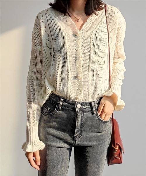 柔らかく優しい肌さわりの透かし編みニットカーディガン薄手でさらっと羽織れるので一枚持っておくと便利なアイテム。丁度いいサイズ感が、ワンピースと合わせやすくバランス良く決まります。特にノースリーブのワンピースに羽織ると◎爽やかな同色のクリアーボタンも可愛いポイント。シワが気になりにくい編み地なので、夏の冷房対策にも。※店頭及び屋外での撮影画像は、光の当たり具合で色味が違って見える場合があります。またご覧いただきますモニターや使用環境により実際の商品と多少色味が異なって表示される場合がございます。予めご了承をお願いいたします。★商品のお気に入り登録→【カートに入れる】右側の♡をクリック完売カラーの再入荷通知や、ラスト1点の通知、セールの通知も受け取ることができます。★ブランドのお気に入り登録→ブランドタグのページからお気に入りをクリック新作商品や再入荷などブランドのお得な情報を受け取ることができます。※ご注文いただいた予約商品のお届け時期の確認は、注文履歴ページより行えます。※他のキャンペーンにより、期間中に価格が変動する場合がございます。※セールは予告なく終了させていただく場合がございます。