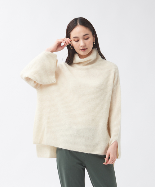 リラックスムード漂うラクーン混ニット *Detail* 秋冬ムードたっぷりなラクーン混ニットが今年も登場! 今年ややゆったりめなオーバーサイズなシルエットに仕上げ、リラックス&カジュアルな印象に! 袖口もスリットを施し、ゆったりめに。 紡績から行った、カリテオリジナルカラーも魅力◎ ネックと袖口に配色ラインを施しアクセントをプラス。 ウールの風合いとラクーンの風合いをミックスすることで、大人な雰囲気に仕上げた逸品。 *Coordinate* ゆったりとしたオーバーシルエットのニットはテーパードパンツやスラックスなドシンプルなボトムと好相性◎ サイドにざっくりと深めにスリットが施されており、ロンTなどとおれヤードスタイルもおすすめ♪