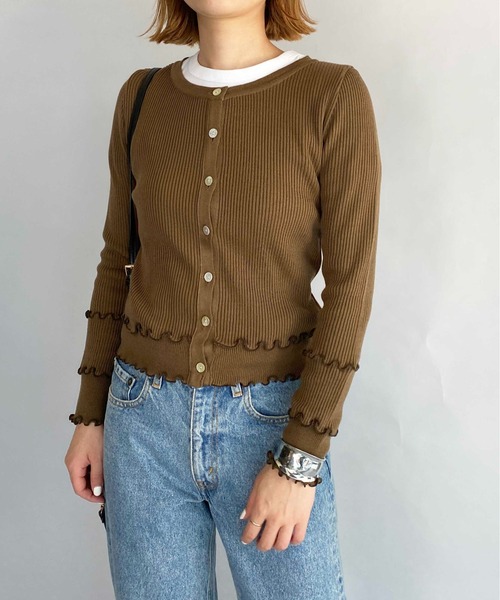 可愛らしいメローデザインのカーディガン。 しっかりめのリブニット生地に裾や袖口にメローデザインをプラスし、 シンプルながらも女性らしさのある1枚です。 カーディガンとして以外にもボタンを閉めてプルオーバーとしても◎ ショート丈でバランスがとりやすいので、 ハイウエストのパンツ、スカートやサロペット、ワンピースの上からにも◎ カジュアルからフェミニンまで幅広くお使いできるアイテムです。 ※撮影場所や明るさにより 実際の商品と色味が若干異なる場合がございます。 ☆商品のお気に入り♡登録を押せば ”再入荷通知”や”残りわずか通知” 値下げのお知らせが届きます! お気に入りのブランド登録していただければ新商品入荷のお知らせも届きますので 是非登録してみて下さい。