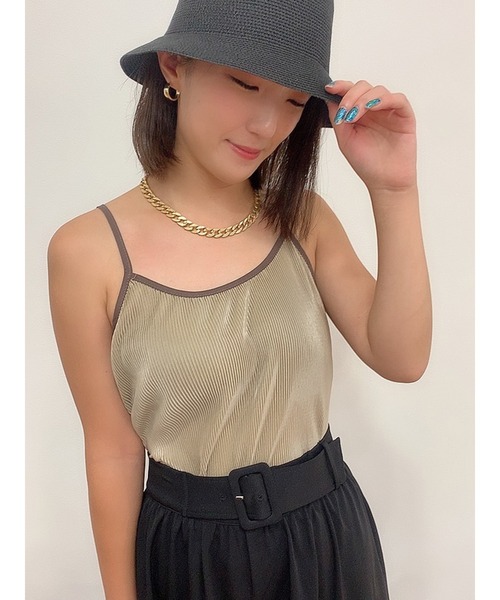 細やかなプリーツと上品な光沢感で、エレガントな印象に仕上げたキャミトップス。ふわっと広がるシルエットと裾のメローフリルが愛らしさを演出。気になるボディラインもさりげなくカバーしてくれます。メイン使いはもちろん、レイヤードコーデのインナーとしてなど、幅広く活躍してくれるアイテムです。