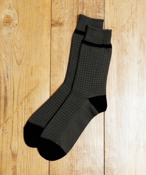 ふんわりとした編みのミドル丈ソックス。 脱いだときにもアクセントになるデザインがポイントです。伸縮性に富んでいるので幅広いサイズの方にお楽しみいただけます。MR.EVERYDAY'S日常生活の中で必要とされるアイテムがもっと豊かな気持ちを生み出し、毎日が楽しくなるプロダクトを提案したブランドです。「毎日必然的に使用するソックスを、どうせなら毎日のコーディネートの一部としてFASHIONを楽しみたくなるものとする。」というコンセプトのもとデビューしました。シンプルにデザインされたソックスは、モダンかつポップな柄と色使いが特徴的で、男性のソックスではあまり見かけることがない様々なカラーバリエーションは、ソックスを変えるだけでも十分に足元のお洒落を楽しんで頂けるものとなっています。またスポーティーなスニーカーからかっちりとしたレザーシューズまで幅広くコーディネートできるように、ミドルゲージで程良いフィット感を意識した編みたてになっており、履き心地と耐久性に優れ、シーズンを問わず毎日履きこんで頂けるような実用性に富んだソックスにもなっています。そしてそのようなソックスを包み込む、まるで本のような一部のパッケージングは、まだ内容を知らない本を本棚から選ぶときのように、楽しみにしながら手に取りたくなる感覚や、友達や彼氏に本をプレゼントする時のように、渡す人にも渡された人にもどこか微笑ましい気持ちが生まれることを願ってつくられました。