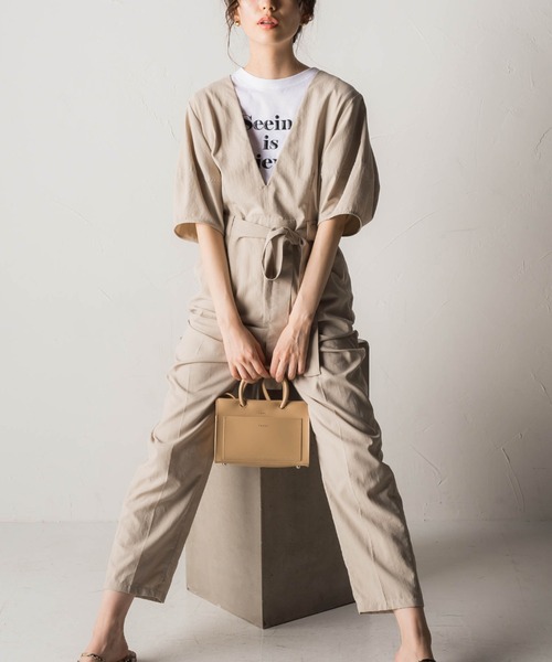 深いVネックとパフスリーブでどこから見ても決まるオールインワン。バックスタイルにもこだわり、太めの背中のパーツを施しモード感をプラス。ウエストはシェイプさせ、テーパードシルエットでスタイルアップして着て頂けます。ウエストベルト付きで型結びして着るとこなれ感が。ウエストは後ろ部分にゴムを入れていますので、気心地も良くなっております。薄手のドライなタッチのしなやかな風合いで、合繊ながら天然素材のようなナチュラル感がある素材を使用し、ワンピース感覚でラフに切れるオールインワンです。夏にはタンク合わせ、秋にはタートルやTシャツなどスタイリングを楽しんで頂けます。----------------------------------洗濯方法家庭洗濯:液温は40℃を限度とし、洗濯機で弱い洗濯ができる。自然乾燥:吊り干しがよい。アイロン:底面温度110℃を限度としてアイロン仕上げができる。ドライクリーニング:石油系溶剤による弱いドライクリーニングができる。----------------------------------※画像の商品はサンプルとなりますので実際の商品と仕様、加工、サイズが若干異なる場合がございます。※お客様のモニター環境により実際のお色と多少異なる場合がございます。※撮影状況や光の当たり具合により、色合いが異なって見える場合がございます。●●●《お気に入り登録》でお買い物をもっと楽しく●●●【商品のお気に入り登録】再入荷のお知らせや、ラスト1点のお知らせ、セールのお知らせを受け取ることができます【ブランドのお気に入り登録】新作商品や完売アイテムの再入荷情報など、お得な情報をいち早く受け取ることができます