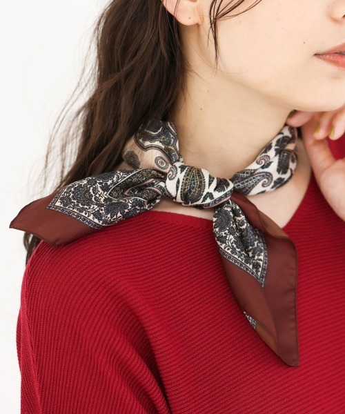 ペイズリー柄スカーフはなめらかな肌触りの素材を使用。使い勝手の良い小判サイズの正方形で補足折りたたんで首元に巻いたり、ヘアアクセ感覚でターバンにしたり、結び目に巻きつけたり、バッグのハンドルに巻いたりと幅広く活躍してくれます。 ※自然光・照明の関係、パソコン・スマートフォンなどの環境により、実際と色味が違って見える場合がございます。予めご了承ください。商品の色味は、詳細画像をご参照ください。 ※サンプルでの撮影となるため、実際にお届けする商品と仕様やサイズが異なる場合がございます。 ▼カラー番号表記 レッド(05)、ブルー(55)