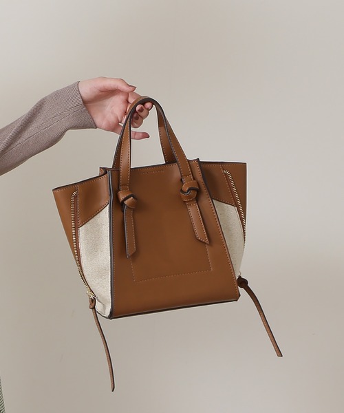 N.で人気のデイリーに気兼ねなく使える、軽め合皮素材のバッグ。小振りなバッグとしても使えますが、サイドジップを開けると、扇状のように広がり収納量を変えられます。ハンドル付け根の結び目もポイントです。サイドの切り替えが大人っぽい雰囲気でコーディネートのアクセントになります。取り外しできるショルダーベルトがセットされた2Way仕様です。