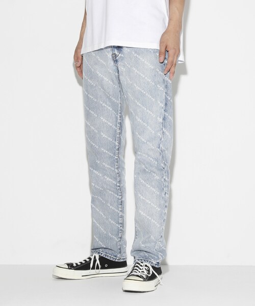 レジェンダのデニムパンツ。ライトオンスのデニム生地にロゴを総柄でプリントした一本。生地は洗いをかけ色落ちを施しアタリを付けたり等もポイント。穿いた際にしっかりとした存在感があり、周りと差がつくアイテムです。