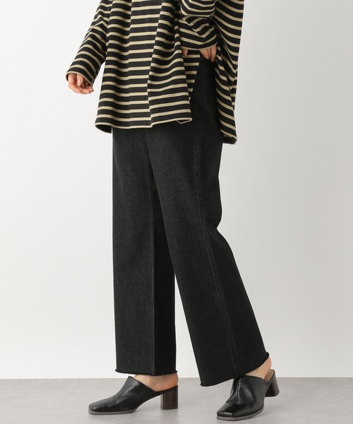 大人気のデニムパンツが再登場! \柔らかくて体に馴染む生地を使用し、更に穿き心地が良くなりました/ ストレートパンツをベースに、ほんのりセミフレア見えするシルエットに仕上げたデニムパンツです。足のラインを拾わず、まっすぐに見えてスタイルアップ効果抜群◎。こちらは裾から4センチ以内はセルフカット可能なので、ご自分に合った着丈に調整できるのも嬉しいポイント。ベーシックなデザインなので、どんなトップスでも相性が良く、幅広いスタイリングをお楽しみいただけます。 ※裾のフリンジは特別な方法でほぐしている為、セルフカット後は全く同じ仕様にはなりません。洗濯後に徐々に裾がほぐれてくるものの、全く同じ状態にはなりませんので予めご了承ください。