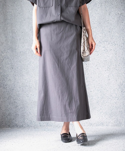 すっきりしたシルエットが女性らしいナロースカート 洗いの加工で柔らかく、こなれた感の生地を使用。腰から裾にかけて広がりすぎないすっきりしたシルエットなので、カジュアルだけど女性らしい印象に決まります。シンプルなのでどんなトップスも相性◎。着回し力抜群です。 ■セットアップでおすすめ■ 商品名:ミリタリーポケシャツ 商品コード:59958012 ブランド品番:955651