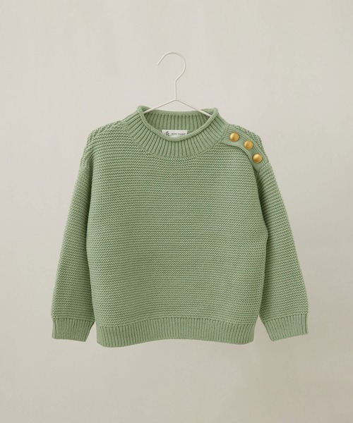 ルーズニットでキッズも今どきな着こなしにチャレンジ!【素材感】 ・インドネシアのジャワ島の都市のバンドンで作られたニット。 ここで作られたケーブルはとても柄が綺麗で風合いもウールが入ったかのような手触りなのも特徴。 ・伸縮性があり着心地◎ 【デザイン・シルエット】 ・凹凸のあるガーター編みのハイネックプルオーバー。 ・左肩にあしらったゴールドボタンがリッチなアクセント。 【カラー】 ・キナリ、グリーン、イエローの柔らかな3色展開。 【スタイリングポイント】 ・フレアスカートに合わせてよそゆきに、ジーンズなどに合わせれば普段使いに。 ・同シリーズでストール(品番:GRN61000)も展開しているのでセットで着用可能。 ・同シリーズでケーブル編みニット(品番:GRM61010)も展開しています。 ----------------------------- 裏地:なし 透け感:なし 伸縮性:あり 生地感・厚さ:やや厚手 季節:冬 ----------------------------- ※詳細画像着用モデル身長:110cm 着用サイズ:120 ※撮影時の光、お使いのモニター環境によって色の見え方が違う場合がございます。