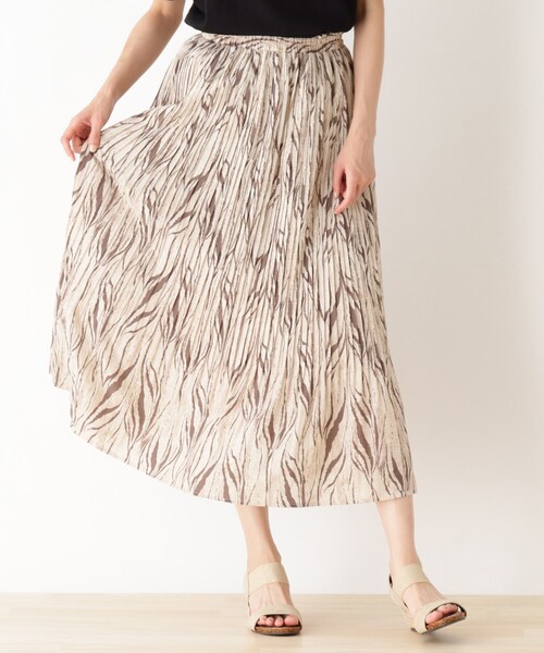 【デザイン】人気継続のプリーツスカートはトレンドのアニマル柄でアップデート!無地とは違った印象のスタイリングに。アニマル柄でも大人が着やすい柄・カラーを選んでいます。※ポケットなし【生地感】サラっとした肌馴染みのいいポリエステル素材を使用しています。※裏地ありモデル情報:身長168cm B75 W60 H87 着用サイズ:00店舗へのお問い合わせ商品番号:256-73003●製品寸法:00(FREE):W62~78cm H86cm 総丈85cm備考: