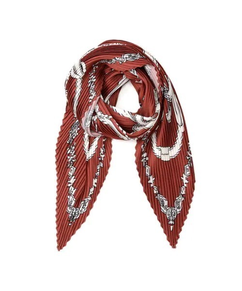 細かいプリーツ生地にオーナメント柄をのせたクラシカルな配色が目を惹くスカーフ。ひし形なので、ボリューム感をおさえてポイントにすることができます。首元に巻いたり、バッグのハンドルに結ぶとアクセントになります。軽い素材感なのでつけ心地もよくコーディネートのポイント使いに最適です。