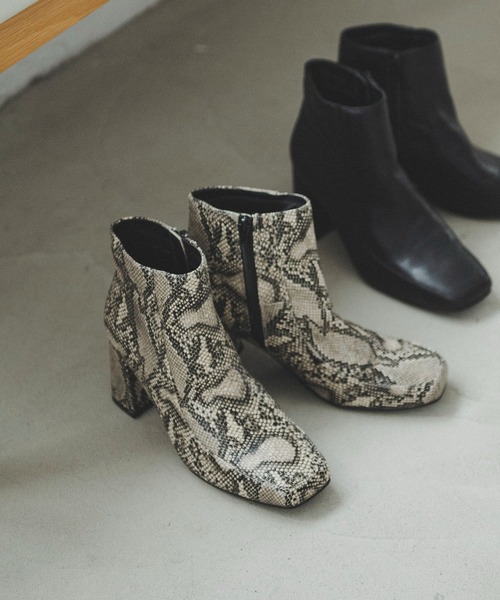 フレアヒールでさりげないデザイン性をプラスしたブーティ。程よい太さと高さのあるヒールデザインで脚長効果を期待できそう。 デザインはシンプルなので、パンツ、スカートやワンピースとも相性抜群です。 コーディネートに取り入れやすい無地ブラックとスネーク柄の2色展開です。