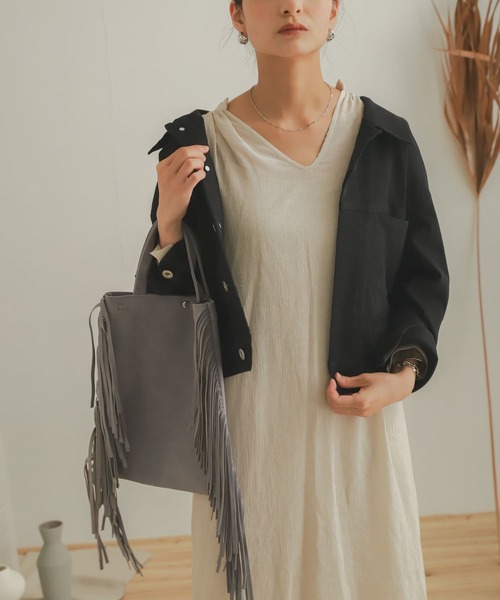 今季トレンドのフリンジデザインは小物で取り入れるのが◎スエード調の素材にたっぷりのフリンジが秋らしい一点。取り外し可能なショルダーベルト付きで使い勝手も◎です。〇トレンドディテールのフリンジ〇取り外し可能なショルダーベルト付き〇コンパクトで使い勝手の良いサイズ感stylingフリンジデザインが程良いアクセントを加えてくれるので、シンプルなスタイリングもこなれた印象に。落ち着いたカラーリングで合わせやすいのも嬉しいポイントです。※この商品に使用されている素材は特性上、摩擦や汗、雨などによる水漏れにより色落ちし、洋服や周囲のものに色移りする恐れがありますので、白や淡色の洋服と組み合わせる際などは、商品のお取り扱いに十分にご注意ください。総重量 : 約330g※商品画像は、光の当たり具合やパソコンなどの閲覧環境により、実際の色味と異なって見える場合がございます。予めご了承ください。※商品の色味の目安は、商品単体の画像をご参照ください。