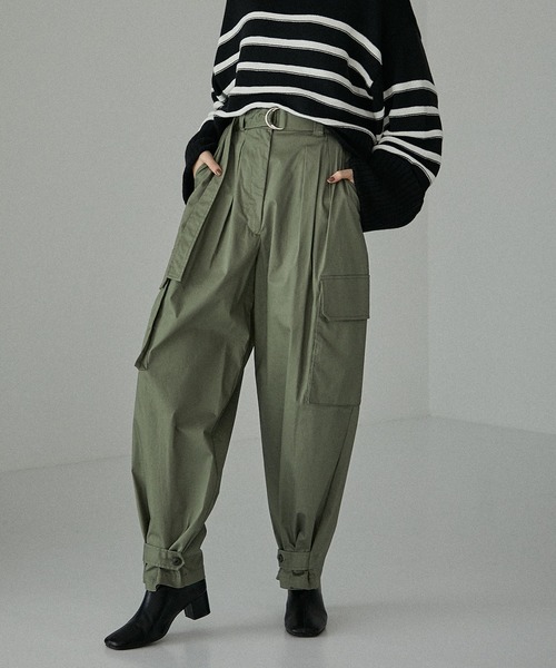 ワークディテールの効いたテーパードパンツ-Detail-ワークディティールを取り入れながら、ハイウエストで女性らしいシルエットが出せるパンツ。テーパーして細くなっている裾も、ボタン位置を変える事でしぼり具合を変えられます。-Styling-ハイウエストで長い共地ベルトが特徴的なのでインするスタイリングがおすすめ。-Fabric-上質なインド綿とフレンチリネンを混紡したストレッチツイルを使用。※こちらの商品は「サンプル商品」で撮影しておりますため、実販売時に”デザイン/素材/サイズ”が変更になる場合がございます。