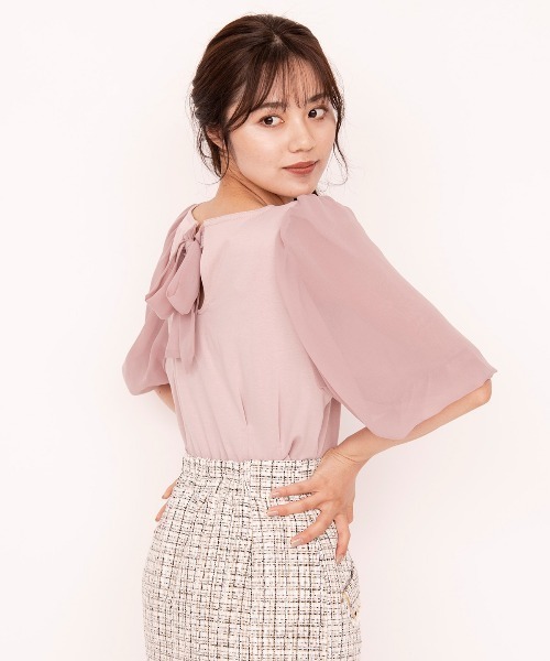 デイリーに着まわせて鮮度アップ♪【デザインpoint】・シアー感が今年らしいボリュームスリーブと、近似色のカットソーのドッキングプルオーバー。・シフォンのバックリボンもポイント♪【シルエット】・身頃にタックを入れてウエストをコンパクトめに仕上げているので、スタイルよく見え、ウエストインもしやすいシルエットです。・ふんわり膨らむボリュームスリーブと、デコルテに沿うボートネックがフェミニンな印象です。【素材】・異素材を組み合わせたハイブリッドトップス。・身頃はソフトなコットン100%カットソーで、デイリーに使いやすいアイテムです。・袖とバックリボンはシアーなポリエステル100%シフォンで、トレンド感と女性らしさを演出してくれます。【スタイリング】1枚着としてはもちろん、トレンドのジャンパースカートなどのインナーとしてもおすすめ。「ファンシーチェックツイードジャンパースカート」とのコーディネートで旬な魅力あふれるフェミニンスタイルの完成♪【care】手洗い可能M:(02):着丈52cm/身幅49cm/肩幅29cm/袖丈41cm/ウエスト76cm/裾幅41.5cm