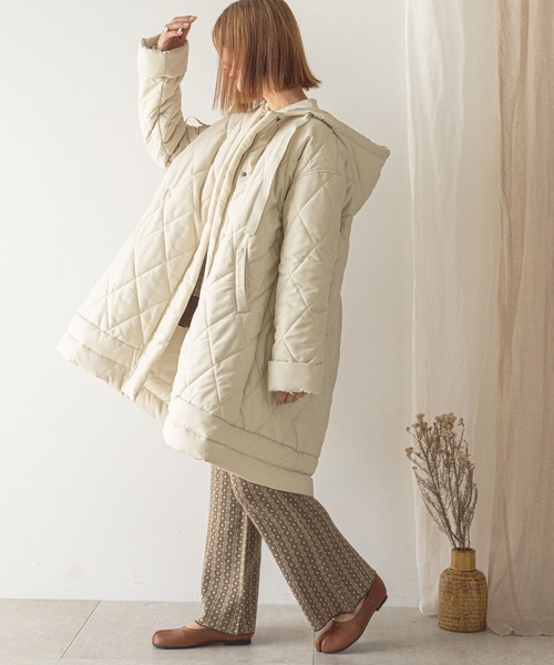 【rectangle 2021AW collection】 Aラインシルエットが女性らしいキルティングコート ・立体的な背中のタックによってきれいなフレアラインに ・中綿入りでとても暖かく真冬に活躍する防寒性に優れたコート ・大きめフードとグログランリボンが女性らしさを演出 ・厚手のニットも着込めるゆったりとしたサイジング ・袖口の折り返しデザインがさりげないポイントに ・軽いので肩こりしにくいのも重要なポイント! キルティングコートは1枚持っていると重宝すること間違いなしです。 膝上まですっぽりと覆う丈感なのでとても暖かく、 見た目のかわいさと防寒機能もきっちり備えた優秀アウターです。 ********************** 透け感:なし 裏地:あり 伸縮性:なし 光沢感:なし 生地の厚さ:厚手 ********************** ※ご覧のモニター環境や撮影環境により実際の商品と多少色味が異なって見える場合がございます。 ご理解の程よろしくお願いいたします。 【お買い物をよりお楽しみいただく為に】 ▼商品のお気に入り登録をおすすめします ♡をクリックしてください。 完売カラーの再入荷や、ラスト1点の通知、 セールの際の通知を受ける事ができます。 ブランドのお気に入り登録もご一緒にお願い致します。
