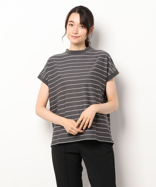 少し高さのあるハイネックデザインがポイントのTシャツ。 フレンチライクなスリーブで気になる肩周りや二の腕も華奢な印象に見せてくれます。 伸縮性のある素材で着心地も良く、デイリーユースにも重宝しそう◎ シンプルな無地やボーダーなどのアソートデザインにも注目です。