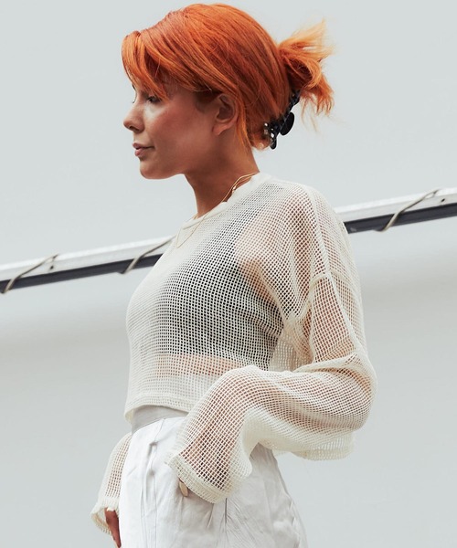 透かしあみショート丈トップス。合わせるインナーによって印象が変わり、着回しにもぴったりなアイテムです◎ 品番:kr21aw-tp03-blk / kr21aw-tp03-wht