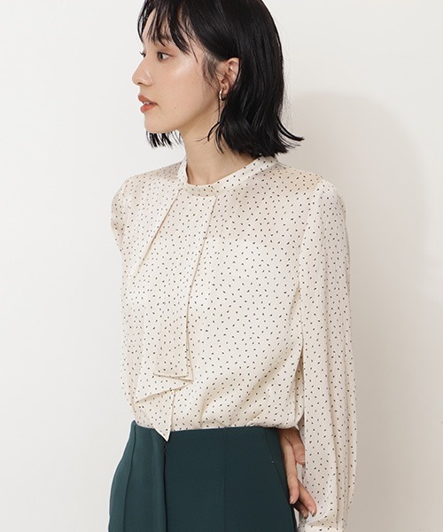 ドビーサテンの生地に細かな三角ドットのプリントを施した、クラシックな雰囲気のボウブラウス。1枚で様になるのはもちろんのこと、ジャケットやコートインにも映える便利なアイテムです。秋らしいカラーの3色展開でご用意しました。※モデルの着用画像の場合、光の当たり具合により、実際の色味と異なって見えることがございます。色味は、商品単体の画像をご参照ください。