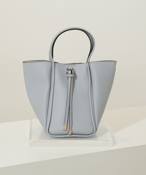 正面と側面から見たとき、2種類の表情が楽しめるミディサイズのトートバッグ。太めのマチを活かしたボクシーで上品なトートバッグは、小ぶりながらもたっぷりした容量で、ペットボトルが縦に収納できます。フロントのリボンチャームが付いた金具を利用し、ショルダーストラップを取り付ければ、アクティブなシーンでも活躍するクロスボディのショルダーバッグに早変わり。印象も用途も全く異なる、一粒で二度おいしいバッグです。※モデルの着用画像の場合、光の当たり具合により、実際の色味と異なって見えることがございます。色味は、商品単体の画像をご参照ください。 美人百花11月号掲載