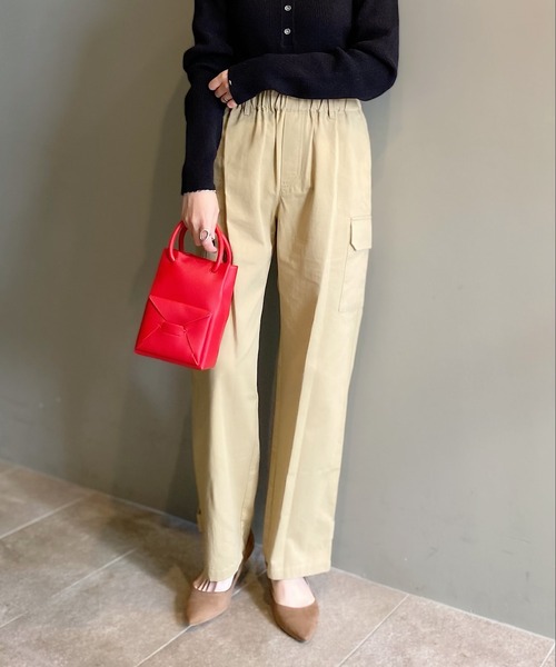ハンサムからガーリーまで、合わせるトップスを選ばないドロストカーゴパンツ●デザインサイドのフラップ付きポケットがカジュアルな印象のドロストカーゴパンツ。適度にゆとりのあるシルエットのパンツは、ウエストがゴム仕様なのでリラックス感のある快適な着用感が魅力です。裾をスッキリとしたラインに見せるベルトがアクセント。ストレートシルエットなので、シーンを選ばずに着回しやすいのもオススメのポイントです。●おすすめコーディネートカットソーはもちろん、甘いデザインのブラウスと合わせたミックススタイルもおすすめ。足元はフラットシューズやスニーカーはもちろん、ヒール合わせでフェミニンな抜け感をプラスするのも◎●素材本体:コットン100%テープ部分:コットン100%・さらりとした肌触りで軽い履き心地洗濯方法:手洗い透け感:なし光沢:なし裏地:なし生地の厚さ:普通伸縮性:なしウエストゴム:ありファスナー:なしポケット:あり【スタッフ着用コメント】《AYANO》身長:158cm/普通/普段サイズ:M/着用サイズ:36サイズ感:ウエストにもゆとりがあり、すっきりとしたシルエットで穿けました。38のほうが腰回り・ヒップまわりにゆとりがでます。素材感:コットン100%ですが地厚すぎず、春夏秋と穿けそうな素材感です。着心地:下半身に窮屈感のない、ゆとりあるデザインで着ていてとても楽でした。《AMA》身長:160cm/普通/普段サイズ:S~M/着用サイズ:36サイズ感:ゆったりとしたサイズ感です。ゆとりのあるストレートシルエットで脚のラインが響きにくいです。素材感:コットン100%でハリ感があります。通気性がいいです。着心地:ウエストがゴム仕様でノンストレスで着用いただけます。《Chihaya》身長:150cm/普段サイズ:M/着用サイズ:36メンズライクになりすぎない、スッキリとしたストレートシルエットです。ストレスフリーなので、カジュアルなトップスを合わせてラフなスタイリングはもちろん、女性らしいブラウスを合わせれば綺麗めカジュアルにも幅広く着こなせます。裾のボタンをくしゅっと止めると、小柄でもスニーカー合わせで履けました!【ご購入されたお客様のレビュー】《身長: 152cm/購入サイズ: 36》ハリ感はもありますが、クタっとしたしなやかなお素材なので、スッキリと着れます。ウエストゴムで着心地抜群です。裾のボタンでシルエットを変えられるのもいいです。・サイズ感:3・軽さ:3・厚み:3・やわらかさ:3・伸縮性:3・透け感:3==============================【注意点】※画像の商品は光の照射や角度、お使いのモニター環境により、 実物と色味が異なる場合がございます。 あらかじめご了承下さいませ。==============================【お買い物をもっと便利に楽しく♪】『♡』をクリックでお気に入り登録・「商品のお気に入り登録」で・・・ラスト1点や再入荷の通知が届きます。登録して頂いた商品だけが対象となる、あなただけのタイムセールが開催されることも!・「ブランドのお気に入り登録」で・・・新商品や再入荷など、いち早くブランドのお得な情報を受け取ることができますので、ご登録をおすすめします! ==============================