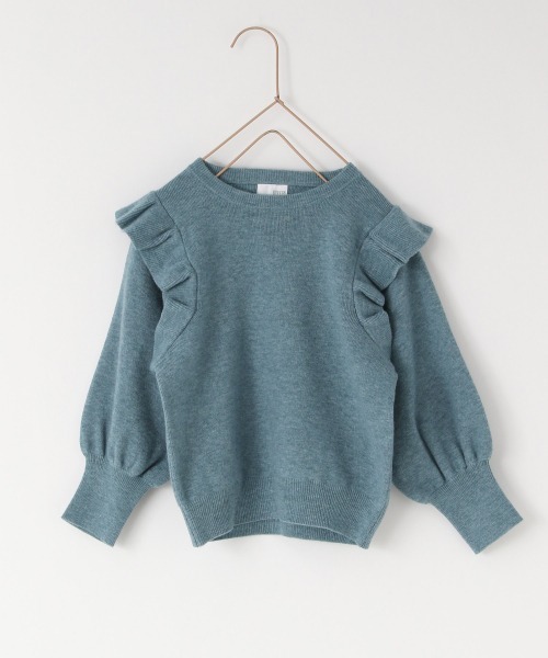 肩からバストにかけてのフリルがポイントのニット。 微起毛の柔らかな素材感なので、かわいらしさがあります。 大人用の215136 コンパクトフリルニットとお揃いなので親子でリンクコーデが可能♪ パンツでもスカートでも合わせやすく、コーデに困らない1枚です!