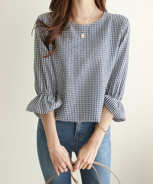 大人のギンガムチェックブラウス■デザイン程よいハリ感がカワイイギンガムチェックブラウス。体に張り付かずにシルエットが出るので体型を選ばずにきれいなシルエットが出ます。袖がきゅっとギャザーでボリュームが出る作りなのも可愛いです。かわいらしくなりすぎない大人っぽく着れるギンガムチェックです。■素材さらっとした気持ちのいい素材。春から秋まで長く着用していただけます。■CoordinateON・OFF問わずに活躍する素材が魅力。シンプルにデニムで合わせた時にも雰囲気が出るのはチェックならでは。シルエットを選ばないベーシックな着丈も魅力の一つ。チェックの雰囲気にはパンツスタイルがおすすめです。