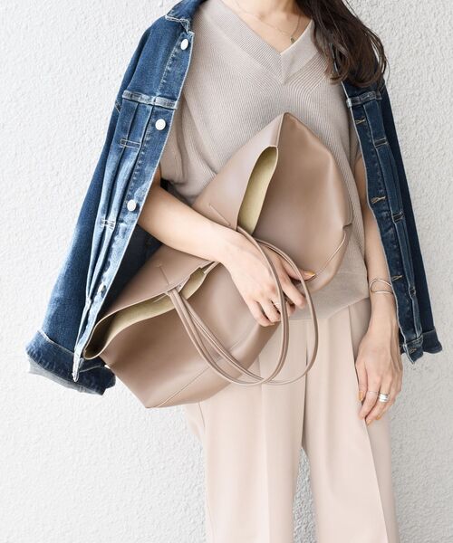 A4サイズもすっぽりと収まるサイズ感のビッグトート。 柔らかいフェイクレザーを使用することで、キレイめな印象になりすぎずオンオフ兼用でお使いいただけます。 ワードローブに馴染むベーシックカラーで、ひとつ持っておくと便利なアイテム。 肩にかけるのはもちろんですが、柔らかい素材なので軽く折った状態でラフに持つのもこなれ感が出ておすすめ◎ シーンやスタイリング荷物の量に応じて、持ち方のアレンジができるのも魅力です。 ※末永く愛用頂く為に、アテンションタグを必ずご確認の上、着用又はお取り扱い下さい。 ※屋外での撮影画像は、光の当たり具合で色味が異なって見える場合があります。商品の色味は、スタジオでの詳細画像をご参照ください。 ※画像の商品はサンプルです。 実際の商品と仕様、加工、サイズが若干異なる場合がございます。