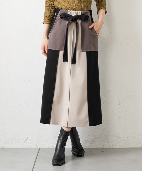 配色デザインがモダンな大人スカート【ポイント】●大胆な切り替え配色が都会的でこ洒落感のある大人デザイン●Iラインのスッキリとした女性らしいナローシルエット●ウエストリボンがタックインスタイルのアクセントに●もっちりとした伸縮性のある滑らかな肌触りの生地感●ウエストゴム仕様なのでストレスフリーに着こなせます●デザインの邪魔をしない目立ち難いバックジップで着脱も簡単に◎【オススメコーディネート】・デザイン性抜群なスカートなので、トップスはシンプルなリブニットを合わせて大人の秋コーデとして着こなすのがオススメ・ブラウス合わせで女性らしく華やかな着こなしも◎・Tシャツと合わせた大人カジュアルスタイルにもピッタリ--------------------------------------------------------------生地の厚さ:普通伸縮性:なし透け感:あり裏地:なし洗濯方法:ご自宅での手洗い可--------------------------------------------------------------【スタッフ着用コメント①】身長168cm / 体型:標準 / 普段サイズ:M~L着用サイズ:F 着用カラー:ブラック第一印象履きやすい!!でした!思ってる以上にゆったりしてるので体型気にされてる方でも着やすいと思います!シルエットも綺麗にみえるし配色が可愛い♡【スタッフ着用コメント②】身長154cm / 体型:標準 / 普段サイズ:M~L着用サイズ:F 着用カラー:グリーン配色のデザインになっていて、1枚でおしゃれに決まるスカート!タイトスカートで、とても形が綺麗でスッキリ見えます!ストレッチがきいた生地で、バックウエストがゴムになっているのでとっても履きやすいです!シンプルなものだと、トップスも合わせやすいです◎--------------------------------------------------------------※商品のお取り扱いに関しましては、商品に付属のアテンションカード、洗濯ネームをご覧ください。※撮影場所やお使いのモニター環境により若干お色味が異なる場合がございます。特にロケの撮影では明るく見える傾向にございます。 ※サイト上ではフリーサイズの表記ですが、商品タグにはMサイズと表記されている場合がございます。その場合、ワンサイズでのご用意となりますのでサイズミスなどではございません。詳しいサイズはサイズスペックをご確認いただきますようお願い致します。※サイト上でのカラー名とお届けした商品に記載されているカラー名が異なる場合がございますので予めご了承ください。--------------------《Information》--------------------【商品のお気に入り登録】→カートに入れる右側の【♡マーク】をクリック!完売カラーの再入荷通知やラスト1点の通知、セールの通知を受け取ることができます。【ブランドのお気に入り登録】→ブランドタグのページから【♡お気に入りショップに追加】をクリック!新商品や再入荷など、ブランドのお得な情報をいち早く受け取ることができます。是非ご登録頂き、お買い物をお楽しみください◎<返品・キャンセルについて>・着用・洗濯後の返品は致しかねます。・商品到着後、着用前に商品を確認して頂きますようお願い致します。