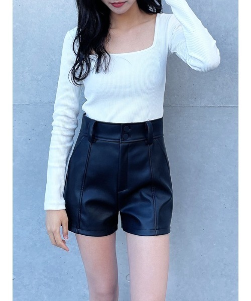 フェイクレザーを使用したショートパンツは、さりげない切り替えとステッチがポイント。オールシーズン着用可能です。