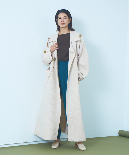 マニッシュなデザインが今年の気分にぴったりなロングコート。ロング丈ですが、圧縮ウールを使用することにより、軽く暖かい優秀なコートに仕上がったます。 フルレングスのボリュームシルエットでボトムス選ばずで着れる万能アイテム。 袖までつながった背ヨークのフレアーやカットオフのヘム仕様、配色ボタンなど大人の遊び心が詰まったこだわりの一着。【Verseau/ベルソー】 フレンチシックベースなオリジナルアイテムをクリアーなカラーと上品なリラックススタイルですべての女性たちへ提案致します。