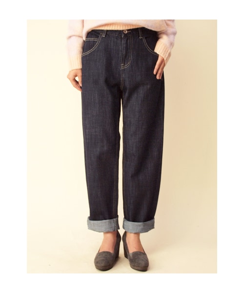 定番のボーイフレンド型が可愛いスラブインディゴデニムパンツ。使い込むうちに味のでるデニムなのでオススメです。※後ろウエストにゴムが入っています。