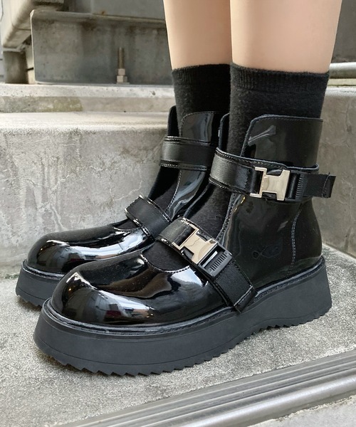 足首と甲のバックルベルトが個性的なショートブーツ。アッパーはU字に開いておりソックスがフロントから覗くデザインで、カラーソックスや柄ソックスなど合わせるアイテムで印象が変わります。アッパーには光沢のあるエナメル生地を使用。傾斜が少ないヒールで長時間履いても疲れにくい。ベルトでサイズの微調整が可能です。《お気に入り登録》・「商品のお気に入り登録」で再入荷通知や、ラスト1点の通知、セール通知も受け取ることができます。・「ブランドのお気に入り登録」で新商品や再入荷など、いち早くブランドのお得な情報を受け取ることができます。【Figments/フィグメンツ】ファッション、音楽、カルチャー。時代とともに変化を楽しむ者たちに向けた、Realityを覆し、常識を壊すユニセックスファッションブランド。